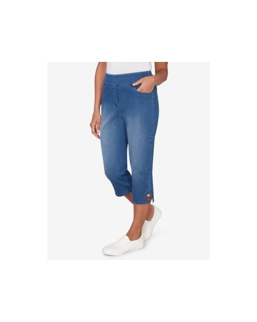 Bright contrast buttons decorate the hem of this lively capri. The flat front and front pockets offer simple structure, adding a playful finish to warm-weather outfits.