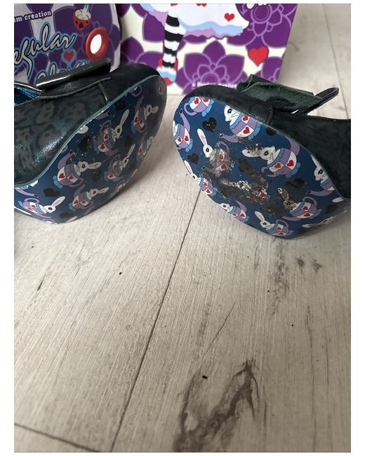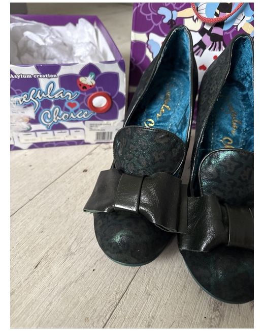The product is a pair of Irregular Choice women's size 6 heels, perfect for a party or cocktail occasion. These multicoloured shoes feature a round toe, high heel (7.6-10 cm), and a bow accent. Made of synthetic material with a fabric lining, these court-style heels are designed for summer wear. The standard shoe width and synthetic outsole provide comfort and durability for a chic and stylish look.