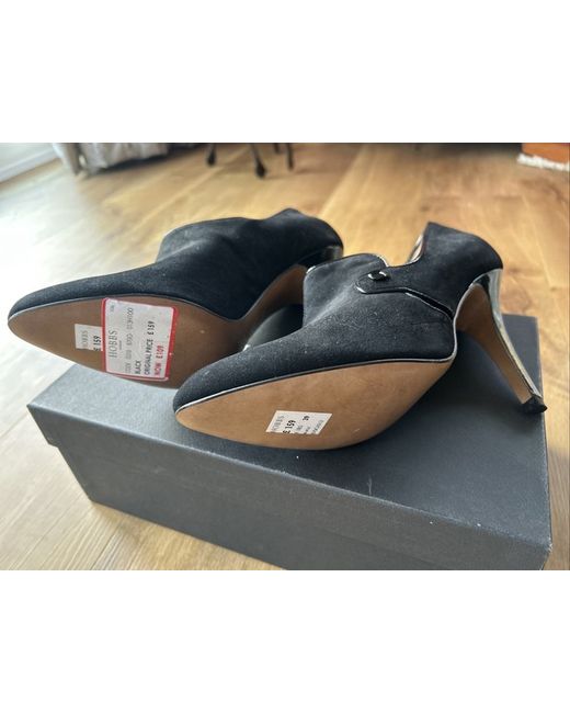 The product is a pair of black Hobbs women's court heels in a UK size 6. Made of faux suede with a leather lining and insole, these standard-width heels feature a sleek design with no pattern or vintage style. The classic black colour and brand name make them a versatile and stylish choice for any woman's wardrobe. Perfect for adding a touch of elegance to any outfit, these heels are a must-have for any fashion-forward individual.