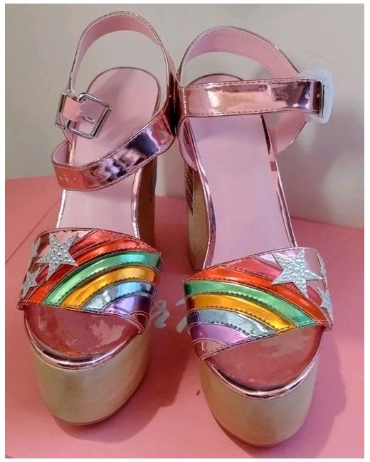 These Sugar Thrillz Dolls Kill Rainbow Platform Metallic Heels Shoes in size US 7M UK 5 are perfect for a party or cocktail event. The multicoloured metallic heels feature a trendy platform style, made from faux leather material. With a standard shoe width and a bold metal theme, these heels are sure to make a statement and elevate any outfit. The brand Sugar Thrillz is known for delivering stylish and unique footwear options, making these shoes a standout choice for any fashion-forward woman.