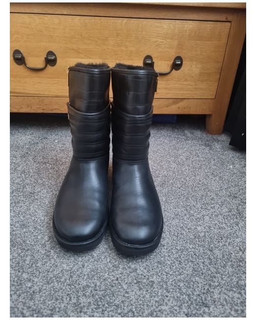 The UGG Aviva Black Leather Boots in size 8.5 are a stylish and versatile choice for women. Crafted from high-quality leather with a classic black colour, these boots exude sophistication and durability. Designed by UGG Australia, a reputable brand known for its quality footwear, these boots are sure to add a touch of elegance to any outfit. Perfect for both casual and formal occasions, the UGG Aviva boots are a must-have for any fashion-forward woman's wardrobe. please see pictures these boots are new but to have a scrath on one side.