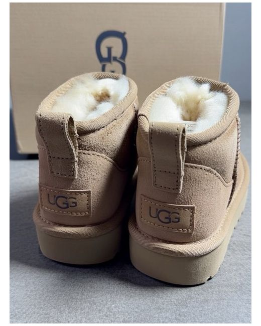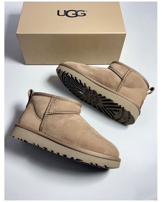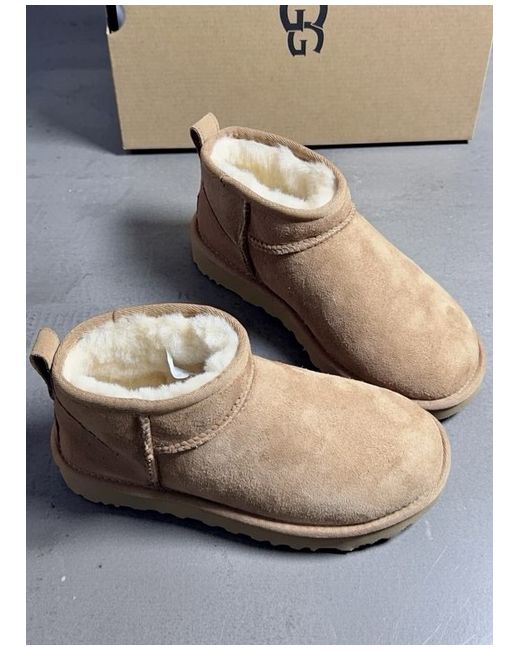 The UGG Australia Classic Ultra Mini Women's boots are a stylish and comfortable choice for the winter season. With a round toe shape, ankle shaft style, and low heel height, these boots feature a sheepskin lining for added warmth and comfort. The brown suede upper material, rubber outsole, and signature UGG logo accent make these boots a fashionable and practical option for casual occasions. Perfect for women looking for a versatile and high-quality bootie to keep their feet snug and stylish during the colder months.