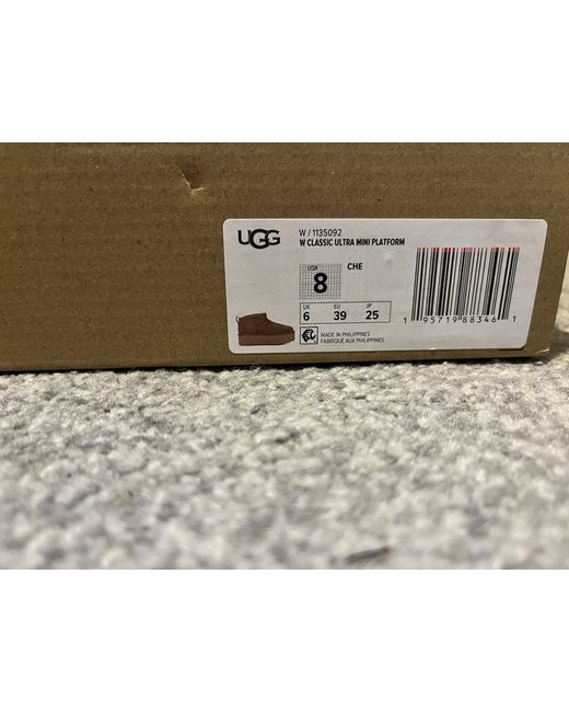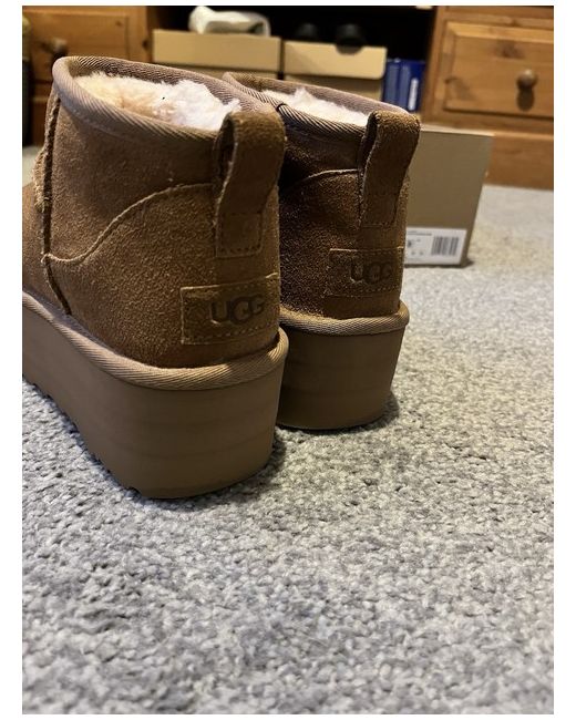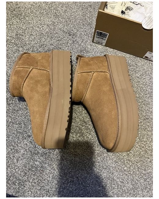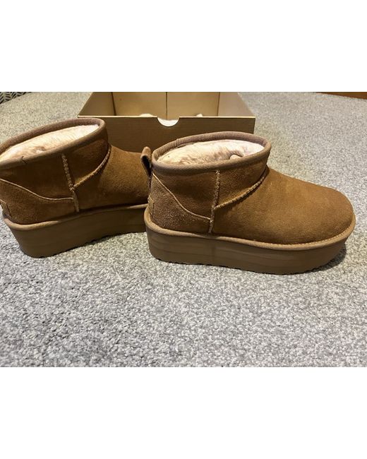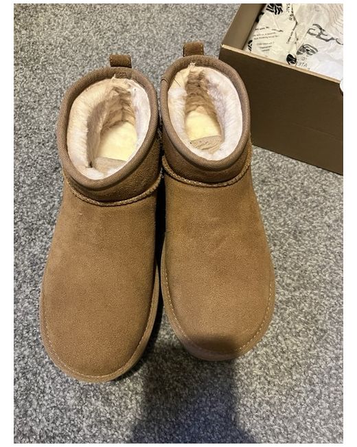 The Ugg Mini Platform Boots in size 6 are a stylish and comfortable choice for casual occasions. With a low heel height and ankle shaft style, these brown suede boots feature a round toe and a wedge heel. The rubber outsole provides stability, while the signature UGG Australia logo adds a touch of luxury to this winter essential. The platform style gives you extra height without compromising on comfort, making these boots a versatile addition to any woman's wardrobe.