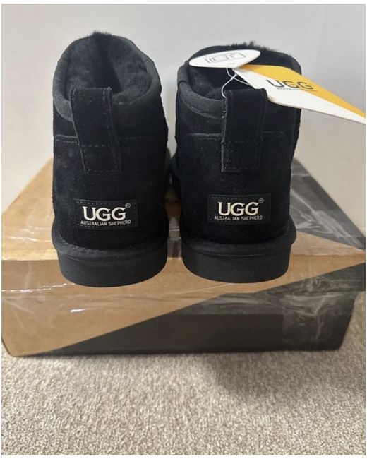 The UGG Classic Ultra Mini Black boots are a stylish and comfortable option for the winter season. Featuring a round toe, ankle shaft style, and low heel, these sheepskin-lined boots are perfect for casual occasions. The classic UGG logo accentuates the black suede upper, making them a versatile choice for both men and women. With a flat heel and rubber outsole, these UGG boots offer a combination of style and practicality, making them a must-have addition to any footwear collection. Never worn - was bought as a gift but too big.