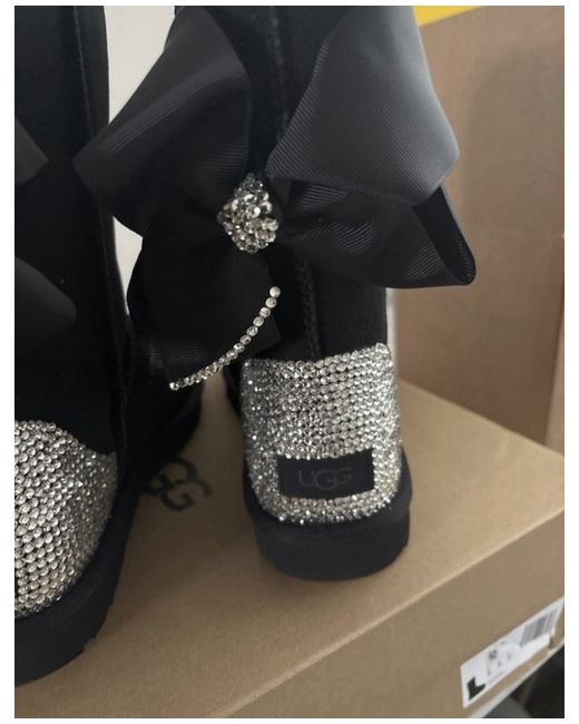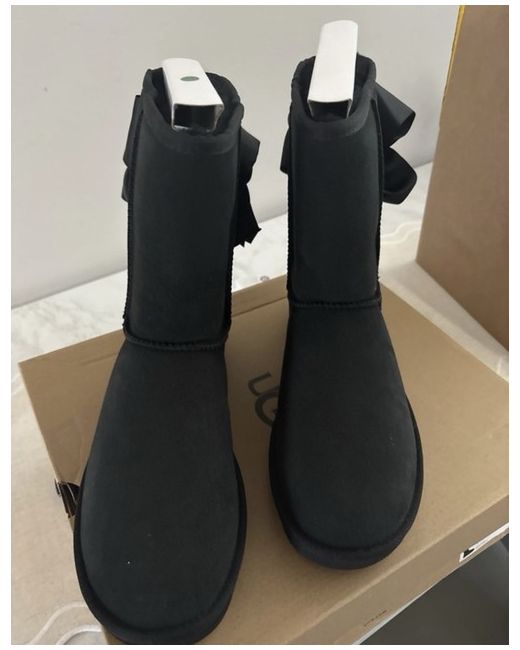 These Classic UGG Boots in size 8 are the perfect choice for a casual occasion in the winter season. Made with luxurious sheepskin lining and a comfortable flat heel, these mid-calf boots feature a round toe shape and a standard shoe width for a comfortable fit. The black suede upper material with the signature UGG Australia logo accents adds a touch of style to these classic boots, making them a timeless addition to any woman's wardrobe. These normally sell for £230. Genuine UGG boots.