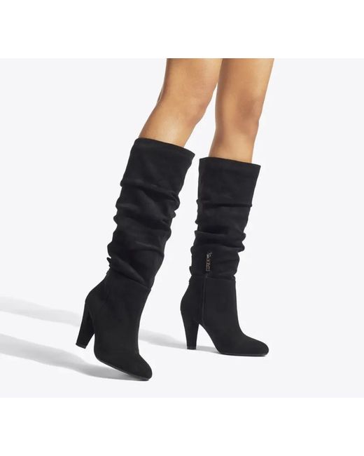 The Slinky knee high boot features a black microsuede upper with scrunch affect. There is a gunmetal branded zip on the inner side of the ankle. The back features a KG Kurt Geiger branded tab as well as gunmetal stud. Heel height: 8.5cm This product has undergone 167 checks to be registered with The Vegan Society This product arrives in a recycled and recyclable box so a plastic bag is not needed This product contains a unique KG Kurt Geiger branded outsole design that has been created specifically for this style Material: Synthetic