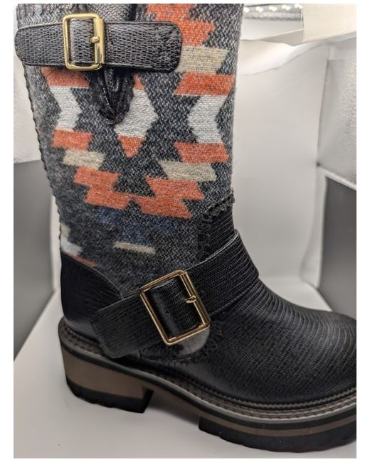 The Irregular Choice Autumn Leaves Black Multicoloured Boots in EU36 UK size 3 are a stylish and unique addition to any woman's wardrobe. Featuring a mid-calf shaft style and round toe shape, these biker-style boots are perfect for the autumn, winter, and spring seasons. The synthetic upper material and standard shoe width ensure comfort and durability, while the multicoloured design adds a fun and fashionable touch to any outfit. Made by the popular brand (no longer trading) Irregular Choice, these boots are sure to make a statement and stand out from the crowd. The box is a little dented and there's a small hole in it (pictured) but the boots inside are pristine, brand new and never worn. ref. fast3100shoe0502