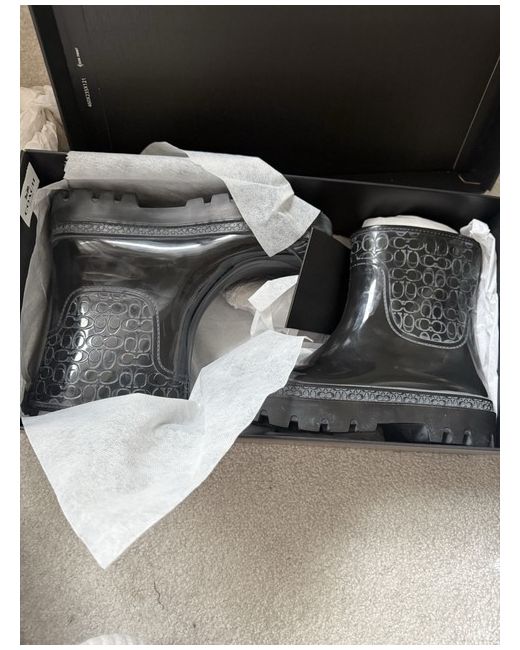 Coach Millie rubber welly boots Size 7. Brand new in the box. Never worn. Got as a gift but just haven’t reached for them at all! Waxy material makes it look a little white, would be fine once wiped over fully. They’ve just been sat in the box. Really expensive! I have the email receipt if needed. Still for sale for £200+ as shown on different websites.