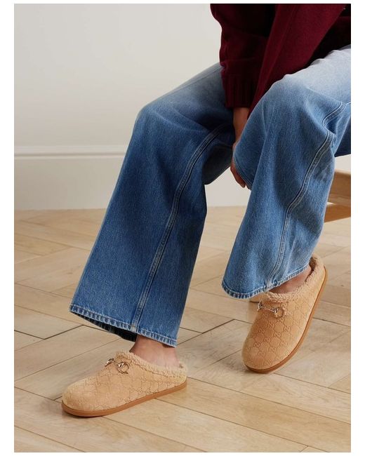 A historic interpretation of Guccio Gucci's initials, the GG motif is a signature Gucci feature. Made from suede with shearling trims, these mules are designed with the brand’s iconic GG pattern and finished with Horsebit hardware. Upper: calf leather (suede) Lining: shearling Sole: shearling insole, rubber sole Color: beige Toe shape: round toe Made in Italy Includes: dust bag, shoe box Designer color name: Butterscotch/Butters Item color: beige Hardware color: gold