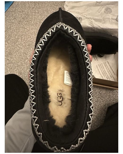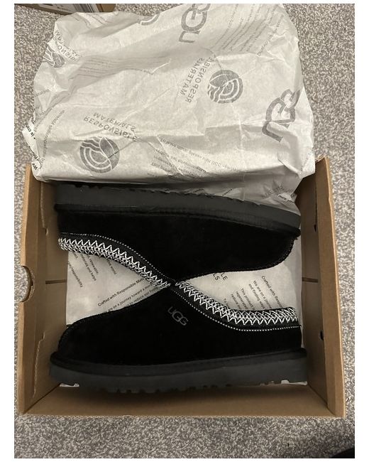 The Uggs Tasman slipper is a stylish and comfortable choice for women looking for a cozy option during the winter months. Featuring a round toe and low heel height, these black slippers are easy to slip on and off, making them perfect for casual occasions. With sheepskin lining and wool insole, they offer comfort and warmth, while the rubber outsole provides durability. Branded with the signature UGG logo, these slippers are part of the Ugg Classic product line, known for their quality and style. Perfect for lounging around the house in style.
