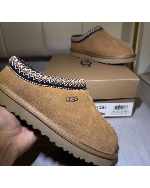 The Uggs Tasman is a stylish and comfortable slip-on slipper designed for casual occasions. Featuring a round toe shape and low heel height, these brown suede slippers are perfect for the winter season. The sheepskin lining and wool insole provide added comfort, making them ideal for lounging at home. With the iconic UGG Australia logo accent, these classic Ugg Tasman slippers in size UK 5 offer both style and practicality for women looking for a cosy and fashionable footwear option.