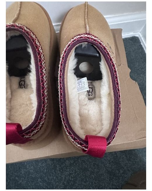 The UGG Tazz Mustard Seed slipper in size 5 is a stylish and comfortable choice for women. Featuring a round toe shape, low heel height, and slip-on closure, these slippers are perfect for casual occasions during the winter season. Made with suede upper material and wool insole, they offer both comfort and warmth. The beige colour and subtle logo accents add a touch of elegance to this platform style slipper from UGG