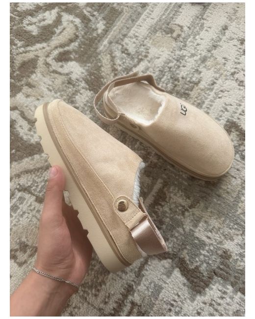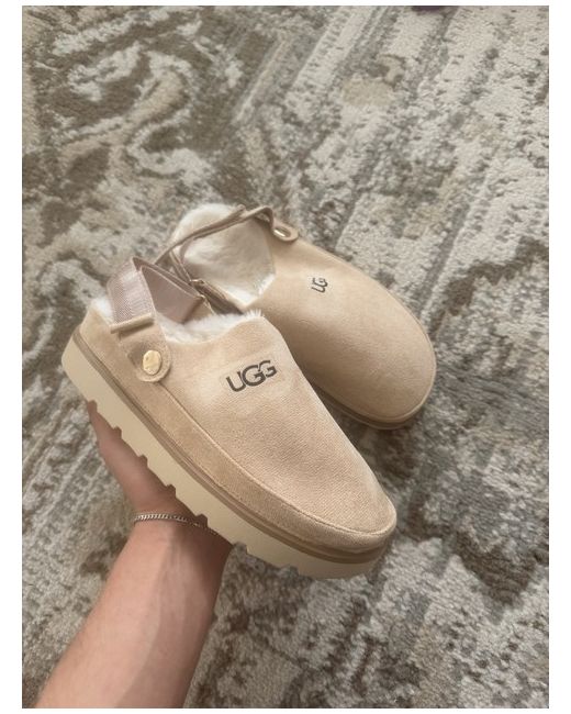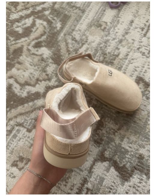 Super cosy and warm with soft sheepskin lining inside. Slip-on mule style with elastic back strap for extra support. Thick platform sole – really comfy and perfect for autumn/winter. In great condition – minimal signs of wear as shown in photos. No major marks or damage. Colour: Beige Brand: UGG Style: Platform slipper / mule Perfect for lounging at home or running quick errands Message me if you’d like more photos or details!