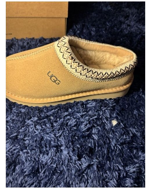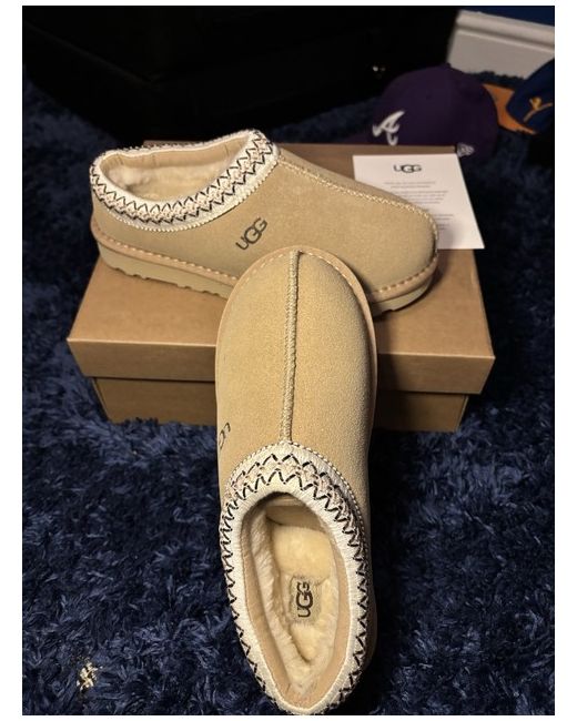 The UGG Tazz Sand slipper in UK size 5 is a classic and comfortable choice for women looking for a casual and stylish footwear option. With a round toe shape, slip-on closure, and low heel height, it is perfect for the winter season. The beige suede upper material and rubber outsole provide both warmth and durability, while the UGG logo adds a touch of sophistication to the design. These slippers from UGG Australia are a must-have for any woman looking for a timeless and practical footwear option.