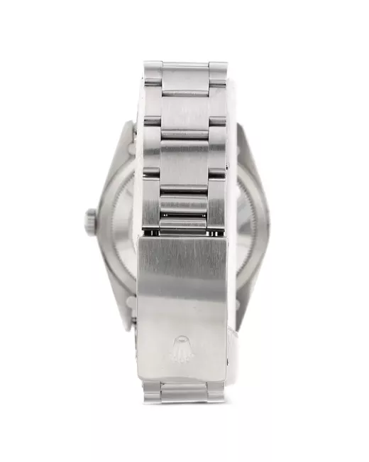 silver-tone stainless steel round face geometric dial baton hands signature Cyclops lens magnified date window automatic movement screw-down crown signature Oyster Perpetual bracelet folding clasp Condition: EXCELLENT. This previously owned item is in near-perfect condition with no signs of damage or use. This item comes with a standard one-year warranty from the boutique.