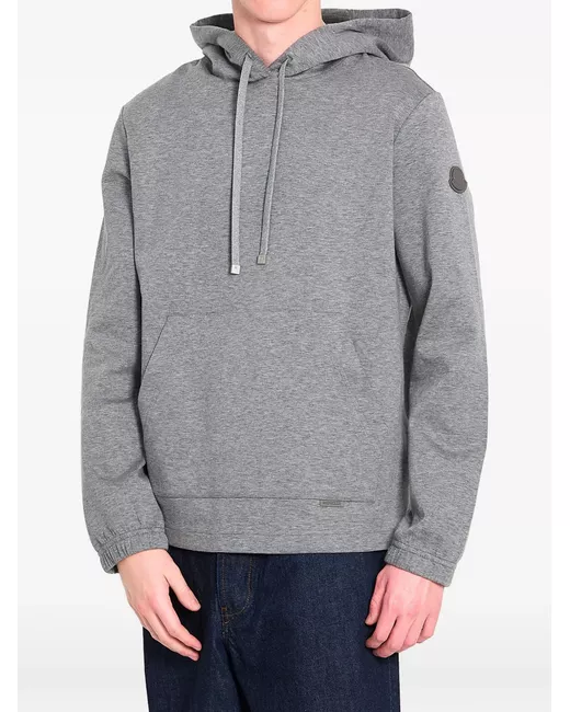 grey adjustable drawstring hood front kangaroo pocket long sleeves ribbed cuffs logo patch signature tab