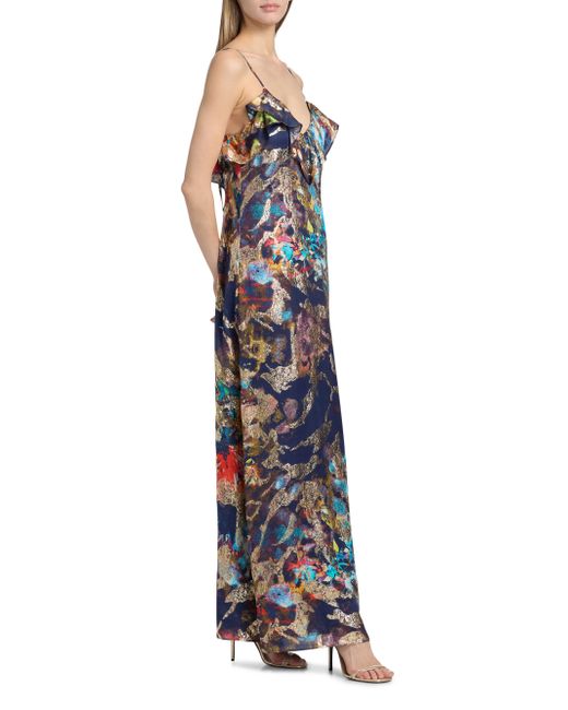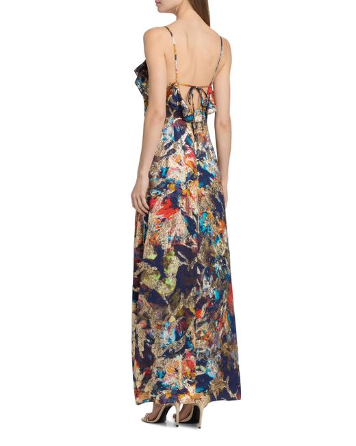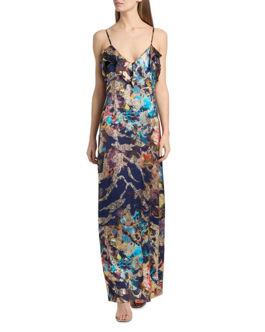 This Cheri gown from Ramy Brook features a printed design with ruffled detailing. Plunging V-neck Spaghetti straps Back tie Pulls over 93% viscose/7% metallic fibers Lining: 100% polyester Dry clean Imported SIZE & FIT About 63" from shoulder to hem Model measurements: 5'10" tall Model is wearing a US size 4. Dress Collections - Contemporary Evening > Ramy Brook > Saks Fifth Avenue. Ramy Brook. Color: Navy Combo. Size: 0.