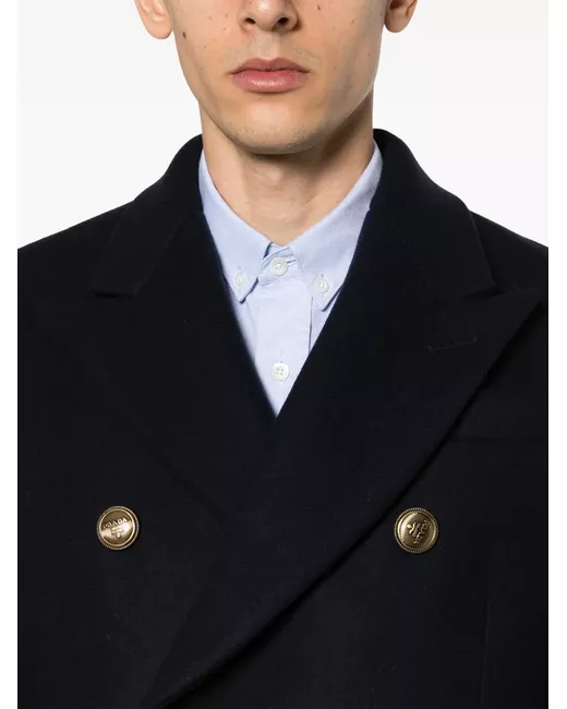 midnight blue virgin wool blend gold-tone buttons peak lapels double-breasted button fastening long sleeves buttoned cuffs chest welt pocket two side flap pockets central rear vent straight hem full lining