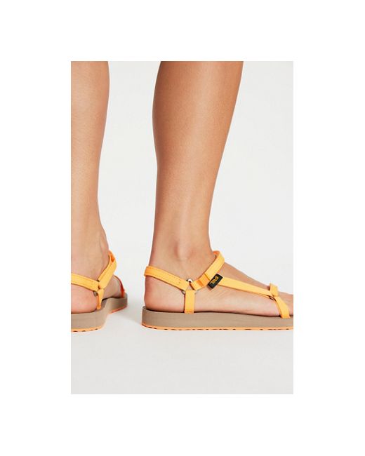 A trekking staple gets a pared-down makeover with this minimalist pair from Teva, featuring slim webbing straps with their signature hook-and-loop closure and comfy footbed. **Features:** Slip-on style, quick-dry webbing straps, hook-and-loop closure, recycled EVA midsole, recycled rubber outsole, anti-odor treatment **Why We Teva Original Universal Slim Sandals at Free People in Papaya, Size: US 6