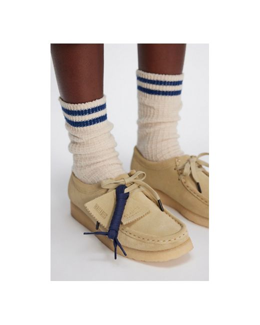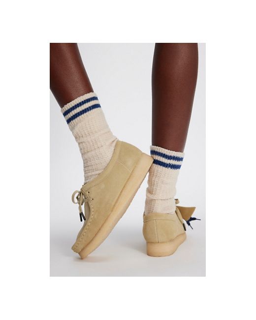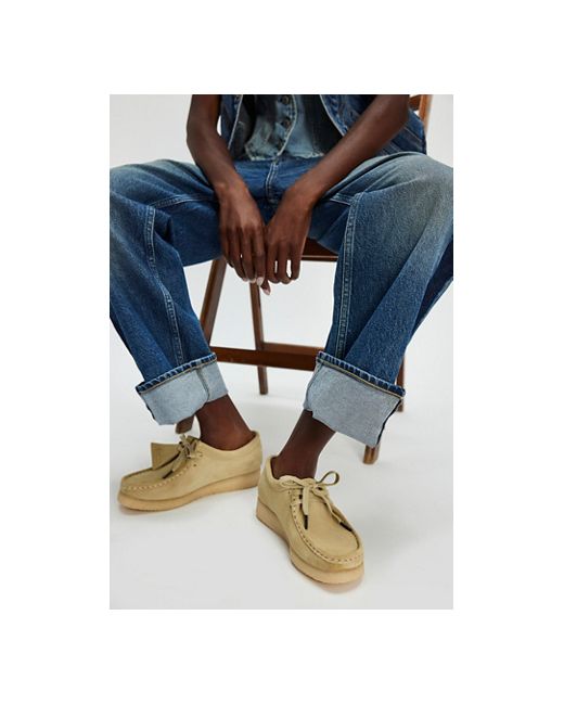 A timeless classic returns: these moccasins from Clarks feature the same details you know and love from the original style. **Features:** Slip-on style, suede uppers, round toe, mocc stitching, EVA midsole, natural rubber crepe sole, 2-eyelet lace-up closure, branded fob **Why We Clarks Wallabees at Free People in Maple Suede, Size: US 6.5