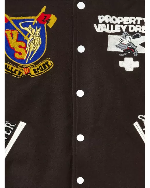 brown baseball collar embroidered design long sleeves striped trim press-stud fastening