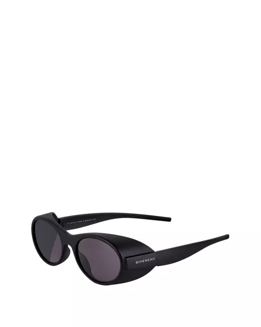 black tinted lenses round frame logo print to the side straight arms curved tips These glasses come with a protective case.