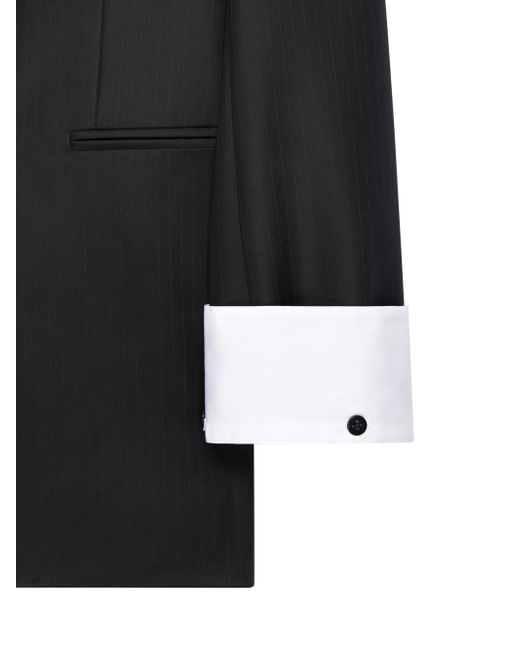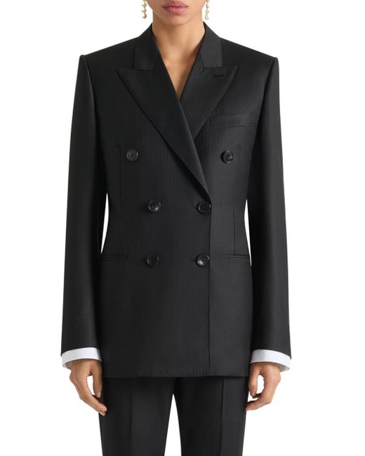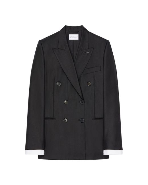 Double-breasted striped blazer in wool. Sarah Burton reexamines the craft of tailoring in the Givenchy atelier cutting womenâ s patterns with a sartorial menswear hand to emphasize the feminine silhouette. Blazer in wool pinstripe Peaked lapel Stitching detail on the collar Double breasted One chest pocket Two front pockets Removable white cuffs details Composition: 100% wool Secondary material: 100% cotton Lining: 100% polyester Made in Italy. Lsd Rtw - Givenchy Rtw > Givenchy > Saks Fifth Avenue. Givenchy. Color: Dark Grey. Size: 2.