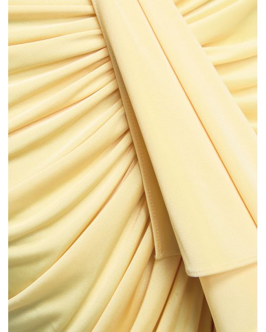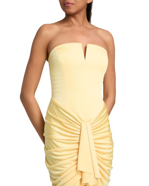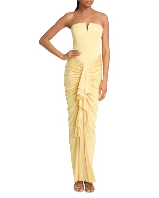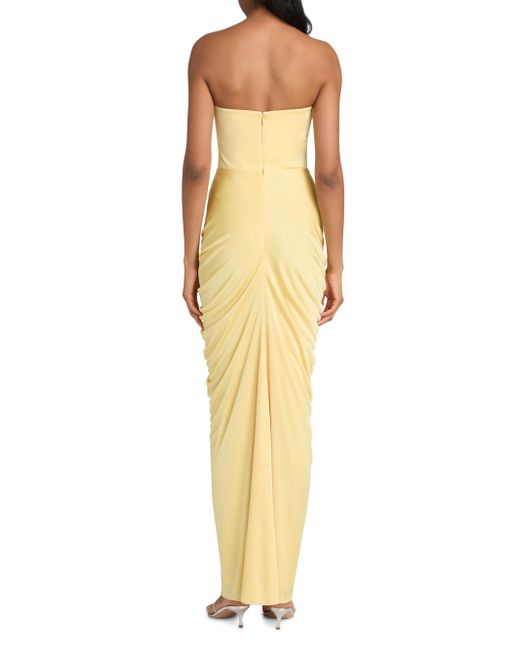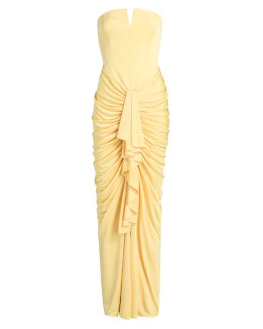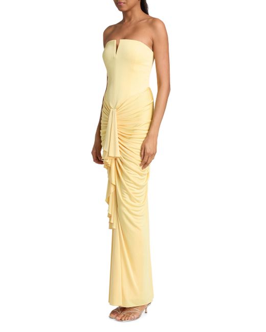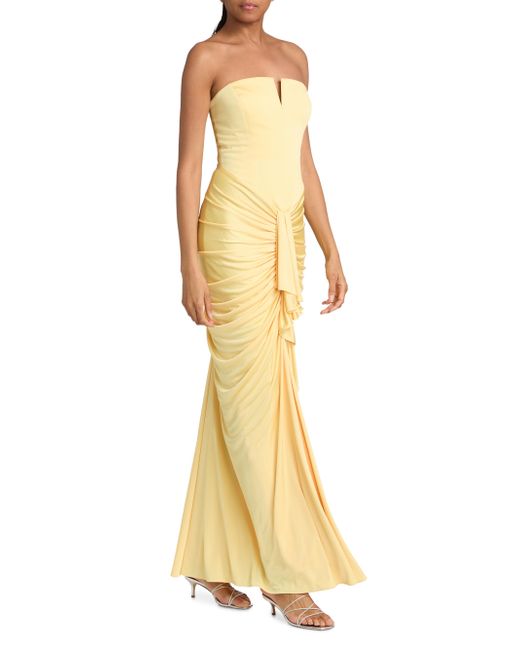 Crafted of glossy jersey, Et Ochs' Selena strapless gown showcases a notched neckline, front draped skirt, and timeless column silhouette. Notch neck Strapless Draped front Concealed back zip closure 100% polyester Dry clean Imported SIZE & FIT About 61.75" from topline to hem Model measurements: 5'10" tall Model is wearing a US size 4. Contemporary Sportswear - Trend > Et Ochs > Saks Fifth Avenue. Et Ochs. Color: Butter. Size: 0.