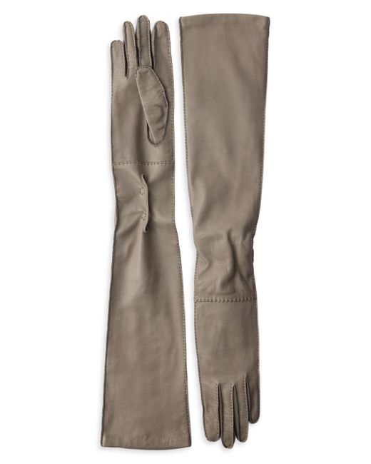 Leather long gloves. Nappa leather Slit at wrist Button detail 100% lamb leather Imported. Lsd Handbags - Prada Handbags Access > Prada > Saks Fifth Avenue. Prada. Color: Grey. Size: 7.5.