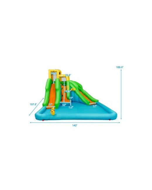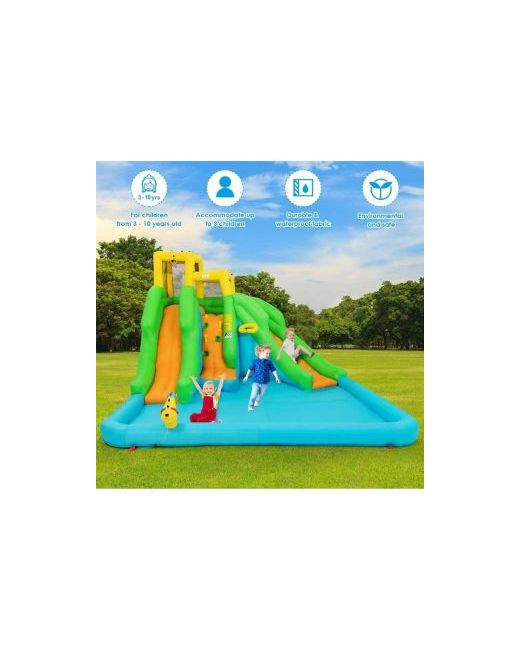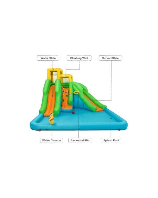Bring nonstop backyard fun to kids ages 3–10 with this inflatable water bounce house. It features double slides, a climbing wall, splash pool, and a basketball rim to encourage active play and sharing with friends. Inflates in minutes and deflates quickly for compact storage in the included carrying bag. Built with durable 840D + 420D Oxford fabric and designed to handle energetic play, with Astm-tested safety. Protective netting adds peace of mind, and the set includes stakes, repair patches, and an inflatable ball for ready-to-play setup.