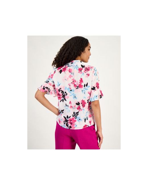 A tied V-neck and short ruffled sleeves bring an elevated polish to this colorful printed blouse from Kasper.