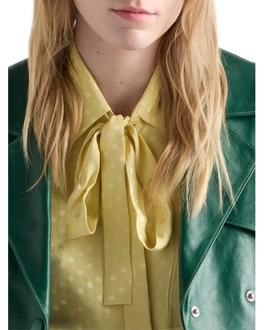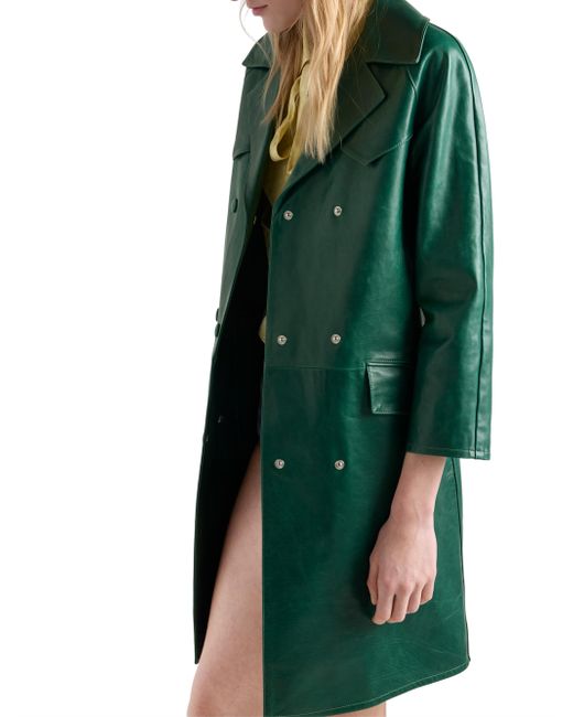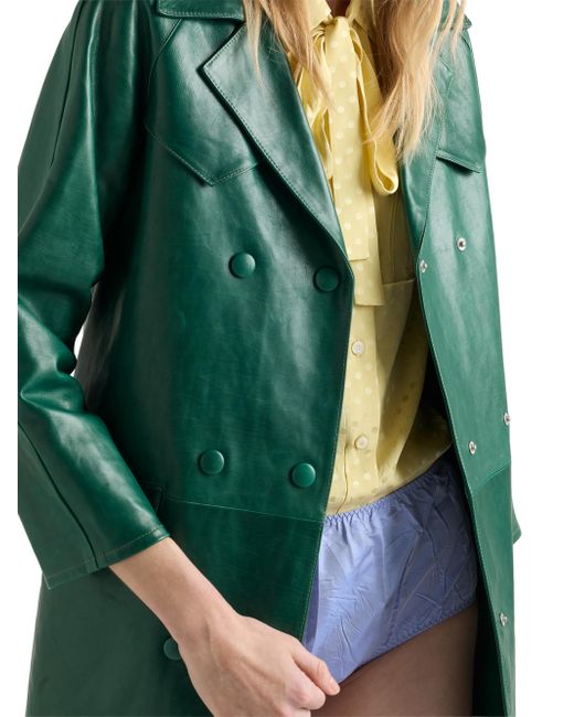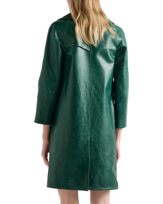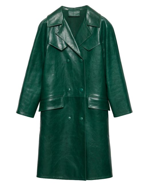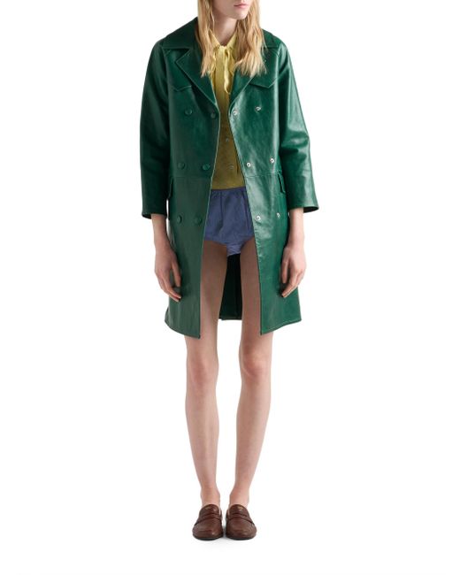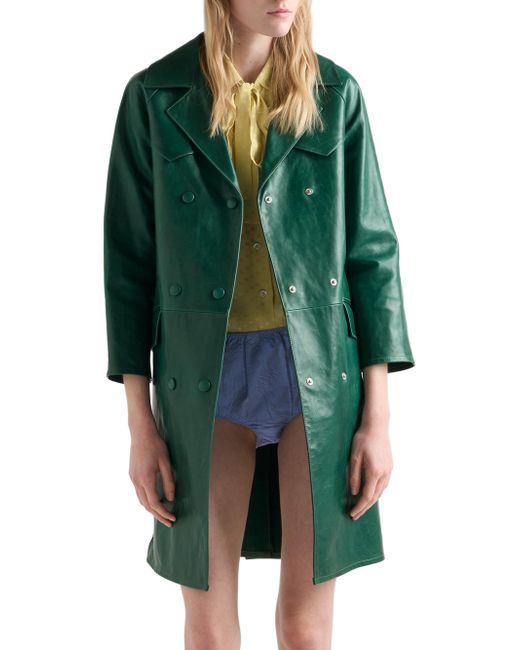 Double-breasted leather coat. Unlined garment Regular fit Center button fastening Back vent Notch lapels Straight sleeves Flap pockets Leather triangle logo on the back 100% lamb leather Imported. Lsd Rtw - Prada Rtw > Prada > Saks Fifth Avenue. Prada. Color: Green. Size: 0.