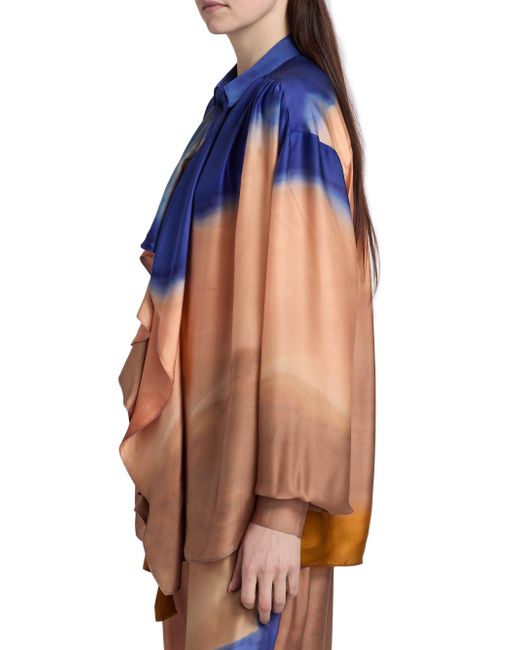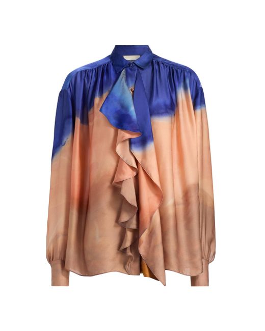 This Gesture blouse from Ulla Johnson is crafted of lustrous silk and defined by a vibrant tie-dye print and ruffle details. Spread collar Long bishop sleeves Button-front closure 100% silk Dry clean Imported SIZE & FIT Model measurements: 5'10" tall Model is wearing a US size 4 ABOUT THE BRAND Manhattan-based designer Ulla Johnson credits her archaeologist parents as inspiration for her namesake ready-to-wear label, founded in 1998. Natural fibers, easy fits and meticulous finishes are seen in each collection, which incorporate sweeping silhouettes, and printing and dyeing techniques from around the world. Contemporary Sportswear - Contemporary Lifestyle > Ulla Johnson > Saks Fifth Avenue. Ulla Johnson. Color: Moontide. Size: 0.