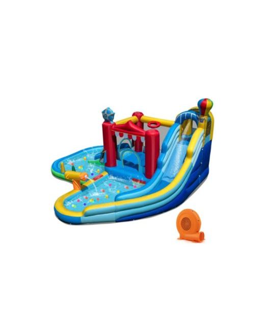 Make summer unforgettable with this wet/dry inflatable water park for kids ages 3–12. It features a water slide, splash pool, and water cannon for cooling fun, plus a ring-toss game, ball pit with 50 ocean balls, bounce area, basketball rim, and climbing wall to keep play going even without water. Built with durable materials and protective mesh walls to support safer play. Inflates fast and includes the accessories you need for easy setup, making it a perfect choice for birthdays, school events, and family gatherings.