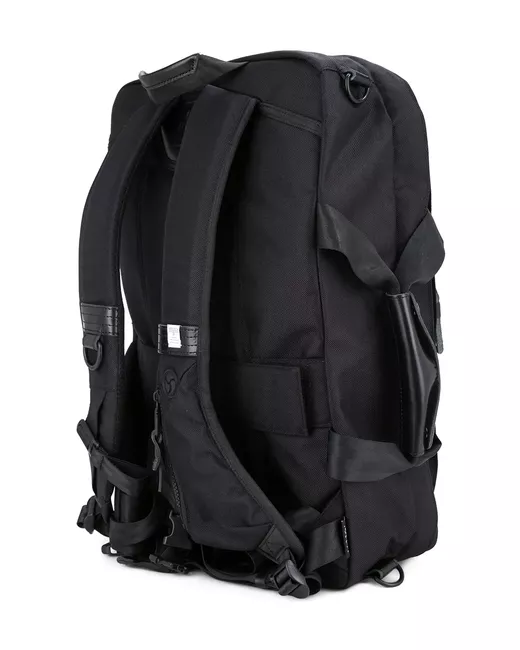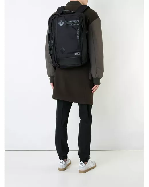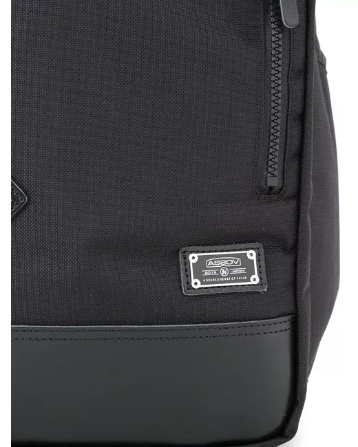 Black Ballistic nylon 3way backpack from AS2OV featuring adjustable shoulder straps, a front logo patch, a round top handle and a zip fastening.