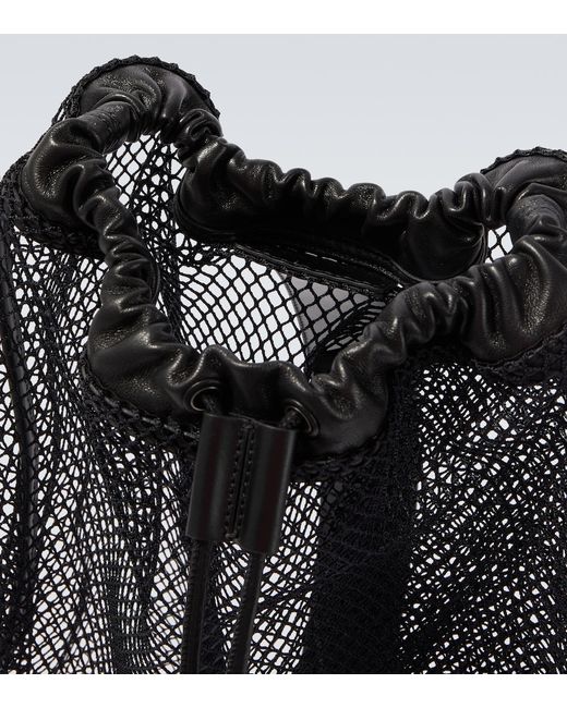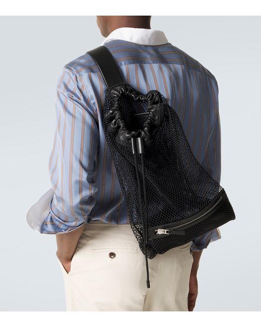 Material: nylon. Lining: unlined. Made in Italy. Designer color name: Black. Hardware color: silver. Trim: lamb leather. Closure: drawstring top. Adjustable shoulder strap. Zipped front pocket. Zipped side pocket. Includes: dust bag.