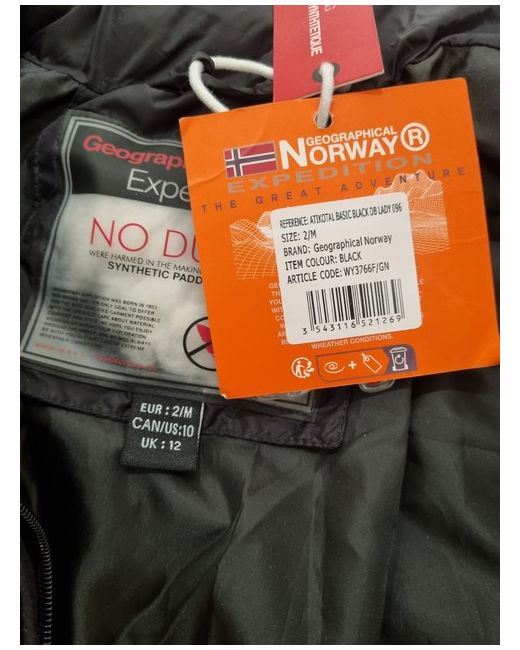 New with tags Geographical Norway Atikotal Basic Lady Puffer Jacket Black colour Size UK 12 Approximate measurements at back of jacket: Armpit to armpit: 49 cm Waist: 47 cm Base of collar to hem down centre back: 62 cm Material: Exterior shell: 100% Polyamid Lining: 100% Polyester Filling: 100% Polyester 1 velcro closable inner left chest pocket. 2 zip closable front waist pockets. Badge on left side of chest. Made in China.