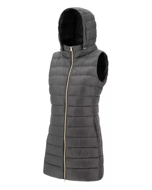 dark grey quilted sleeveless two-way zip fastening hooded neckline straight hem