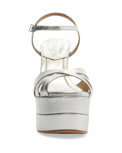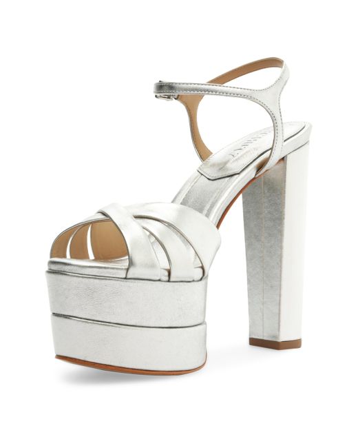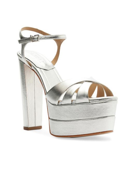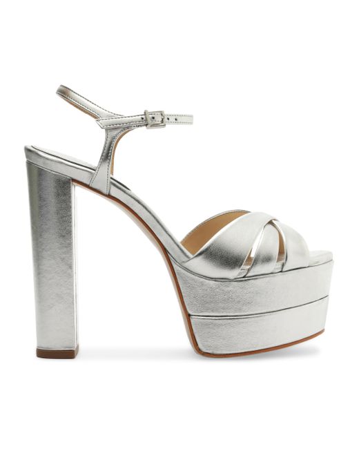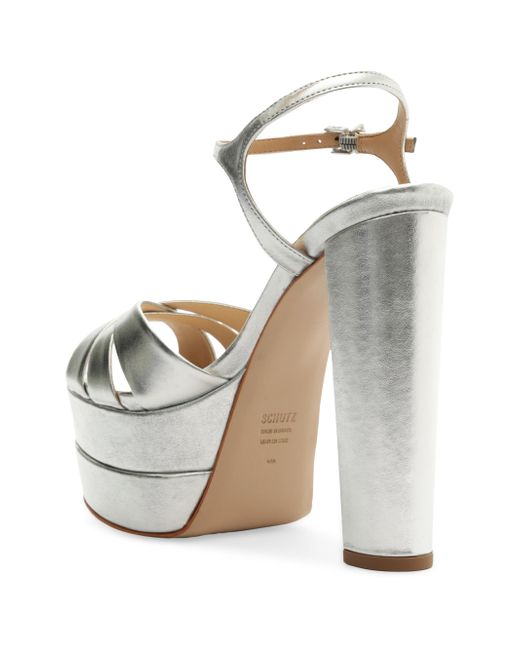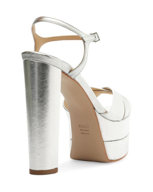 Crafted of metallic leather, Schutz's Keefa platform sandals feature a crisscross design, a slim 140mm block heel, and an adjustable ankle strap. Open toe Buckle closure Leather upper Synthetic lining Leather sole Imported SIZE Block heel: about 5.5" (140mm) Platform: about 3" (75mm). Women's Shoes - Contemporary W Shoes > Schutz > Saks Fifth Avenue. Schutz. Color: Prata. Size: 5.