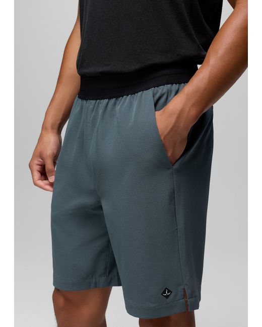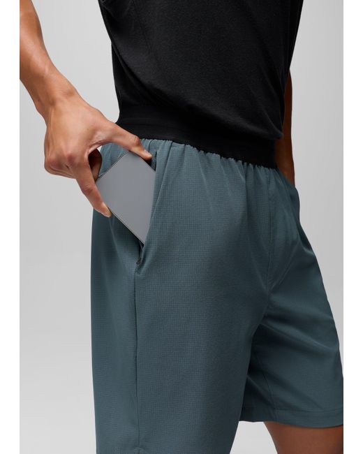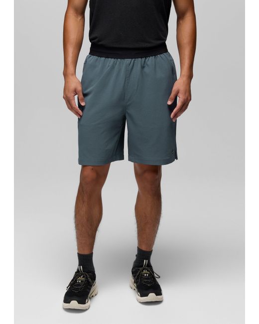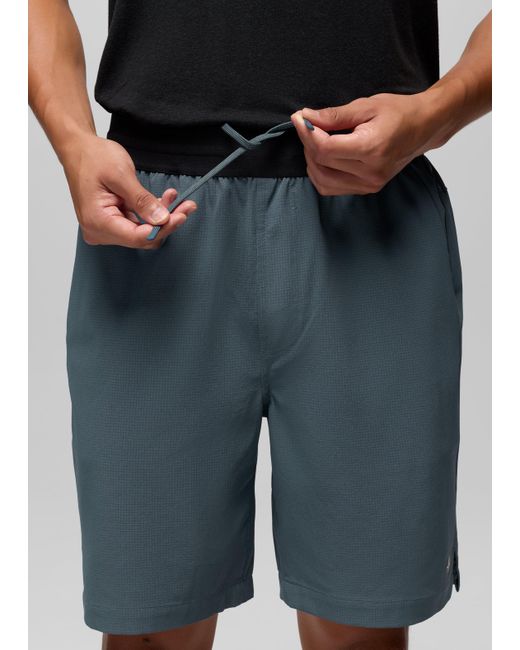 An active short made with recycled fabric that keeps you comfortable and distraction-free, however you choose to sweat. A go-to for active lifestyles, the Hybridizer Breathe Short is made for outdoor workouts, getting reps in at the gym, and any other way you choose to move. Built in a recycled performance fabric that offers moisture-wicking, breathable comfort, and UPF 40 coverage, this short has an elastic waistband with an adjustable drawcord, an 8-inch inseam, and a zippered side pocket for securely stashing your stuff. | Mens prAna Hybridizer Breathe Short in Grey Blue, Size Large