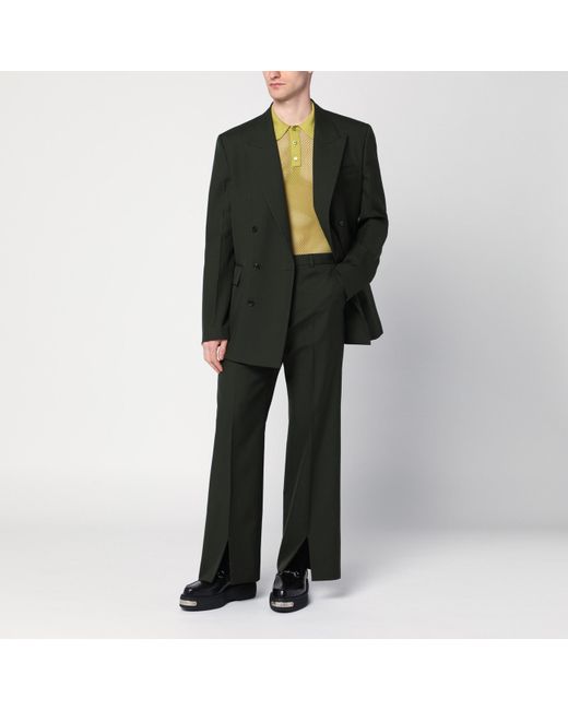 Double-breasted Gucci jacket in military green wool featuring a lance lapel a welt pocket on the chest with tone-on-tone embossed logo lettering long sleeves with buttoned cuffs front button closure two flap pockets on the front and a back vent.