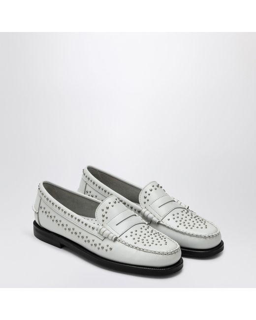 Classic Sebago moccasin in grey and white leather characterized by a round toe tone-on-tone mask small silver studs all over and a leather sole.
