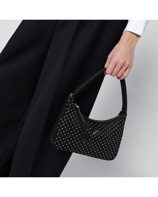 Black Nylon handbag from Prada featuring small all over studs a zip fastening a ribbon handle an enamelled metal triangle logo on the front and silver-tone metal hardware.