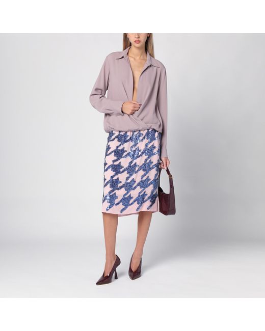 Pink silk skirt from Dries Van Noten featuring contrasting sequin weave adjustable drawstring waist and small side slit.