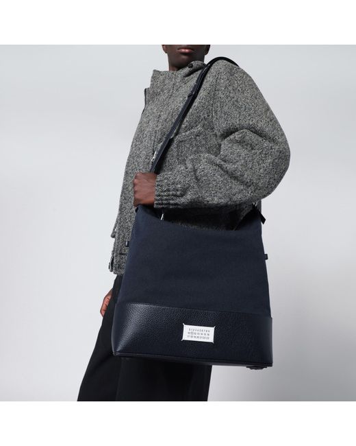 Medium bag by Maison Margiela in canvas and dark blue leather featuring an adjustable shoulder strap zip closure patch with Numeric Signature on the front a flat internal pocket and Four Stitches logo on the back.