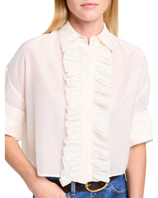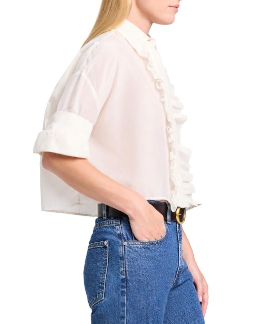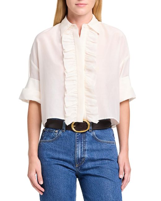 Cut in a slightly cropped, relaxed fit, the Next Ex blouse from TWP is crafted of a cotton-silk blend, showcasing a ruffle-trimmed placket. Point collar Elbow-length sleeves Button-front closure 70% cotton/30% silk Dry clean Imported SIZE & FIT Model measurements: 5'10" tall Model is wearing a US size Small ABOUT THE BRAND New York-based label TWP offers modern, effortless takes on go-to wardrobe staples. On a mission to democratize luxury, founder Trish Westcoat Pound, of Haute Hippie fame, focuses on high-quality details and subtle-yet-alluring silhouettes to create elevated, everyday pieces-all made in the U.S. with fabrics sourced from Italy. Contemporary Sportswear - Contemporary Lifestyle > Twp > Saks Fifth Avenue. TWP. Color: White. Size: XS.