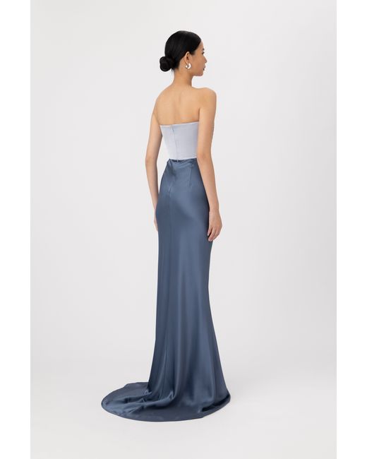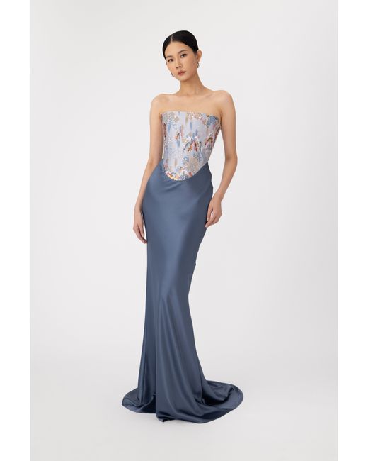 The Isha gown is crafted from crafted from luxurious satin. The sculpting corset bodice showcases intricately embroidered and embellished Shanshui landscapes inspired design. The sleek satin bias-cut skirt flows from the waist enhancing the hourglass figure.