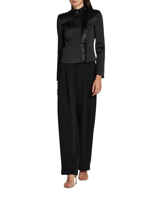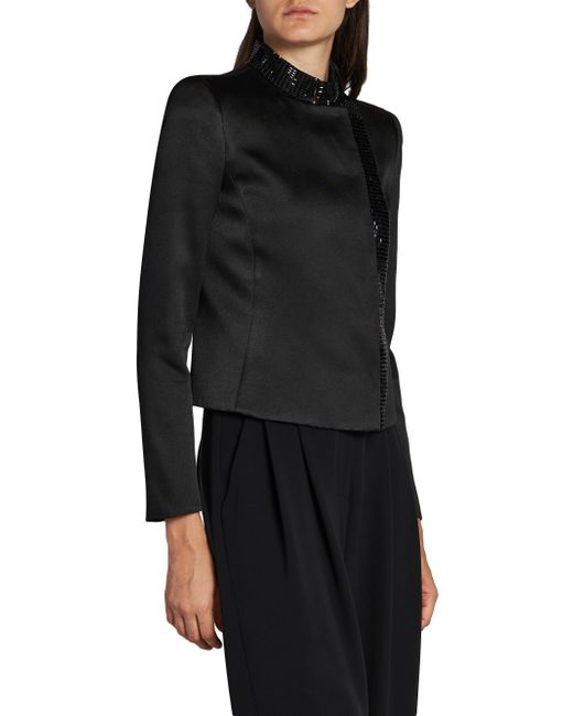 Giorgio Armani's slightly cropped evening jacket, crafted of a silk-blend lustrous satin, is intricately embellished with tonal bugle beads for a fluid, shimmering effect. Stand collar Long sleeves Front snap closure 82% viscose/18% silk Lining: 100% silk Trim: 100% glass Dry clean Made in Italy SIZE & FIT Model measurements: 5'10" tall Model is wearing a US size 4 ABOUT THE BRAND Since launching his self-named fashion empire in 1975, Milanese designer Giorgio Armani has both revolutionized women's and men's fashion, and the fashion industry writ large. His now signature silhouettes forged new directions at the time, with more natural fits and neutral colors. To this day, the Armani name is synonymous with an effortless and approachable Italian aesthetic that can be found in its expertly tailored clothing, accessories and beauty collections. Advanced European - B30 Consignment > Giorgio Armani > Saks Fifth Avenue. Giorgio Armani. Size: 12.