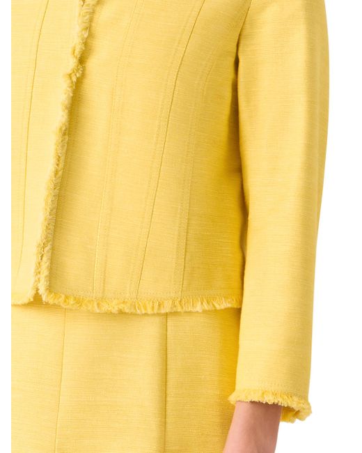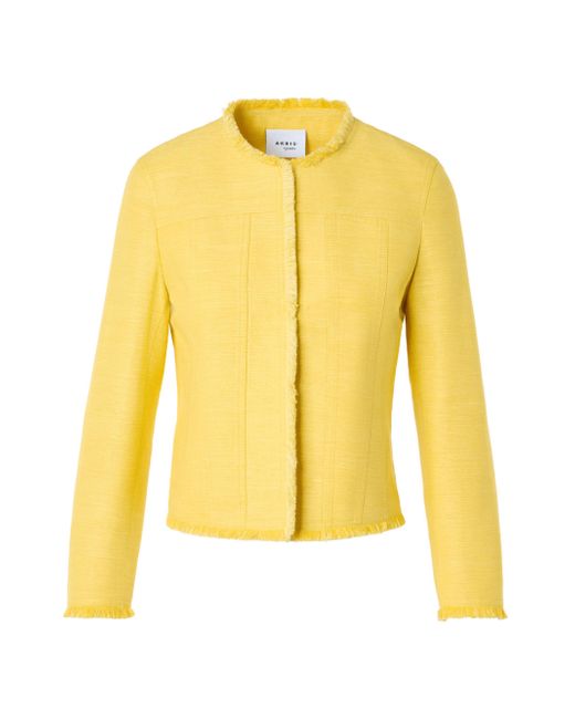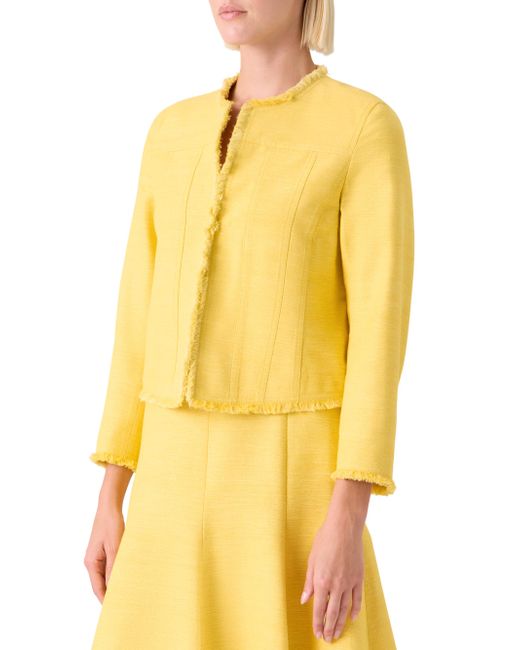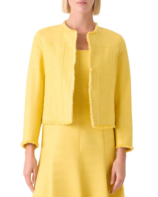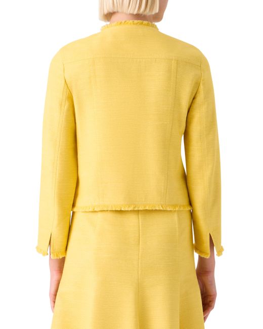 Crafted of a silk and cotton, this jacket from Akris punto is designed with frayed trim, a round neck, and long sleeves. Round neck Long sleeves 83% silk/17% cotton Lining: 100% cupro Dry clean Imported SIZE & FIT Model measurements: 5'10" tall Model is wearing a US size 4 ABOUT THE BRAND Founded in 1922 in St. Gallen, Switzerland, the name Akris was derived from founder Alice-Kriemler Schoch's initials. Akris punto was later launched in 1995 with a relaxed, understated mindset. With a range of contemporary looks including architectural silhouettes, graphic prints and colorblocking, each piece is finished with an athletic edge. Designer Lifestyle - Akris Punto > Akris Punto > Saks Fifth Avenue. Akris punto. Color: Lemon Zing. Size: 4.