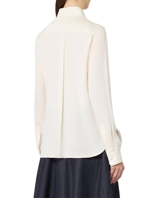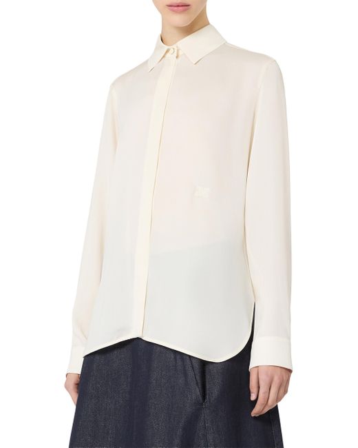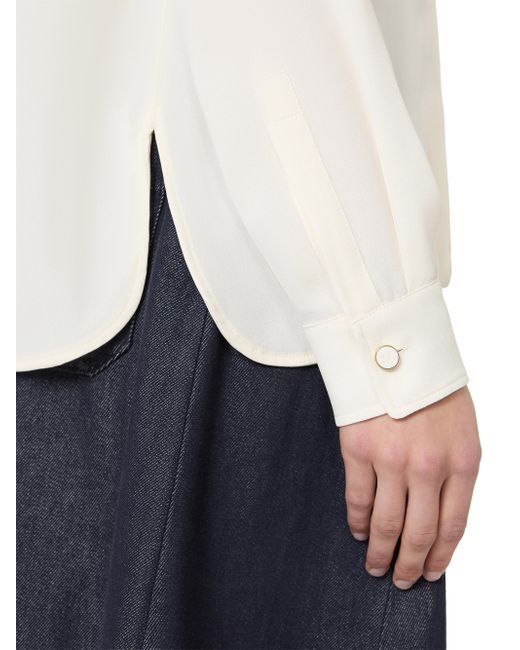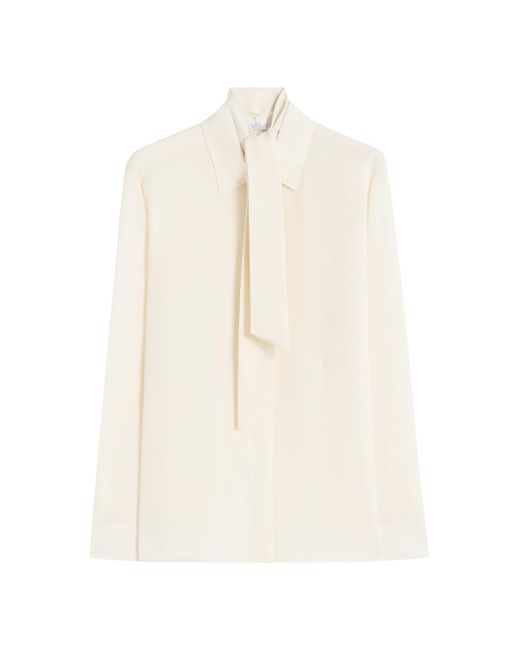 Mannish shirt featuring a removable matching neckerchief and tonal embroidered monogram detail on the front. Heavy silk charmeuse shirt Fitted waist Shirt collar and double cuffs Set-in sleeves Concealed button fastening on the front Darted yoke and a central pleat at the back Rounded hem with side slits Fabric 100% silk; exclusive of embroideries Do not wash; do not bleach; do not tumble dry; cool iron; professionally dry clean perchloroethylene - mild process; do not wet clean; put this item into a string bag before washing it; wash the garment while it is fastened; do not iron the buttons; protect buttons before washing; turn the articles inside out before washing Imported. Lsd Rtw - Womens Rtw Lsd Mp > Max Mara > Saks Fifth Avenue. Max Mara. Color: Ivory. Size: 0.